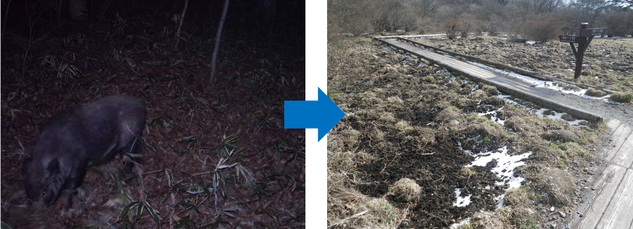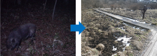 ▲イノシシによる掘り起こしの様子(左図は那須平成の森、右図は那須平成の森近くにある八幡園地)