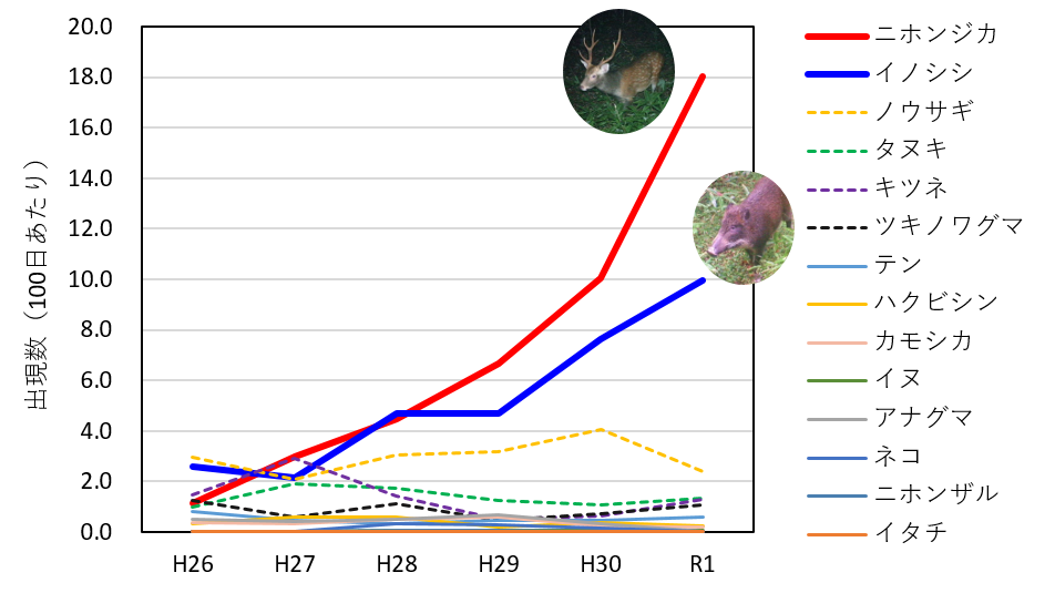 ニホンジカとイノシシの急激な増加が一目瞭然です!
