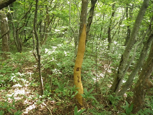 ▲樹皮剥ぎ(那須平成の森) ▲林床植生の衰退(塩原地域)