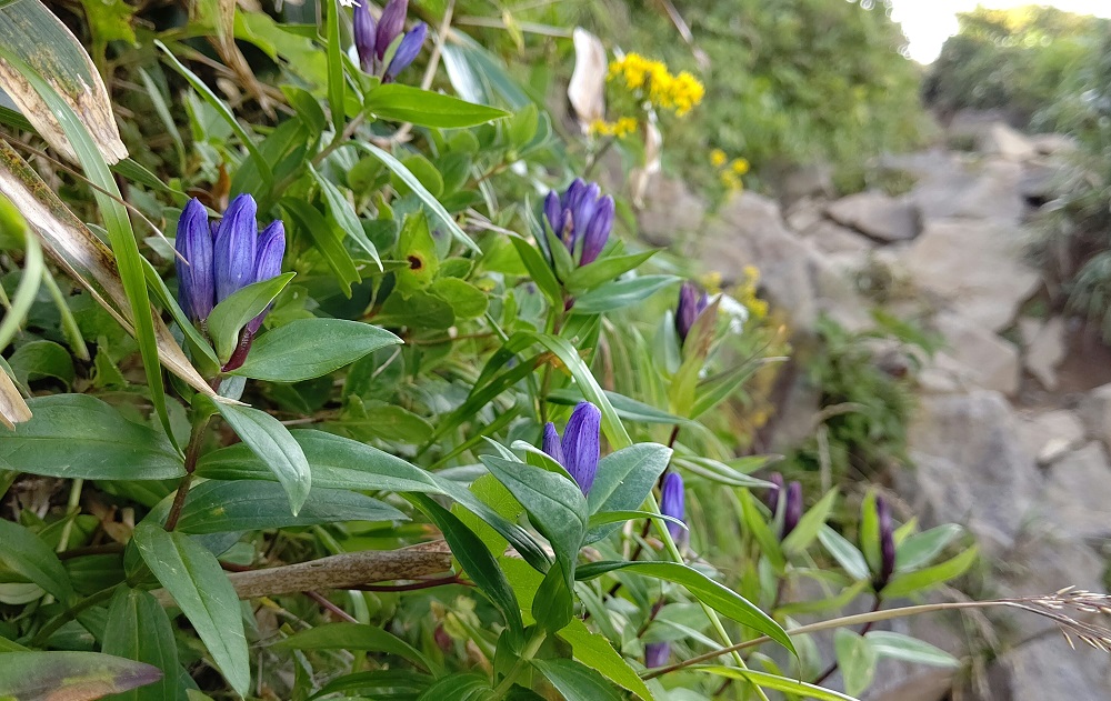 ▲光を浴びるカリヤスモドキと茶臼岳 ▲道端に咲くオヤマリンドウ