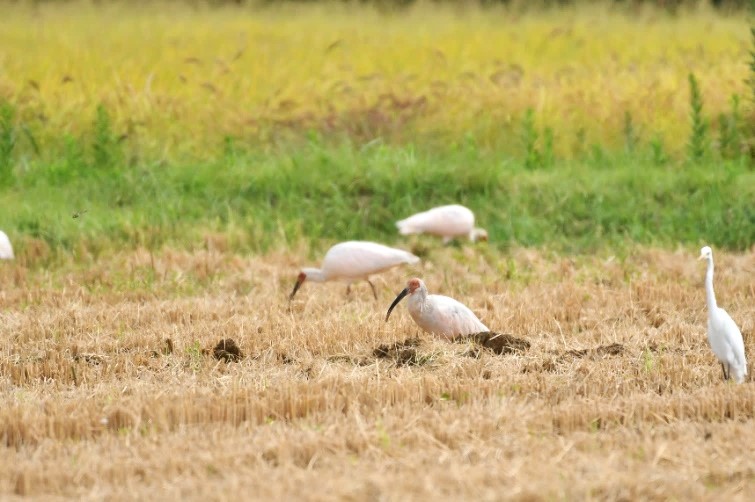 佐渡の田んぼでも稲刈りが次々と始まり、餌が採りやすい刈田にトキがたくさん舞い降りるようになっています。
