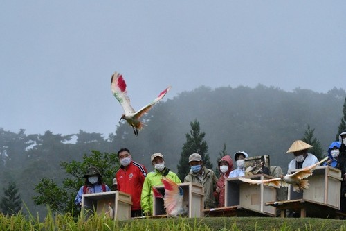 ▲放鳥されるトキ(個体識別用に羽に色が塗られています)