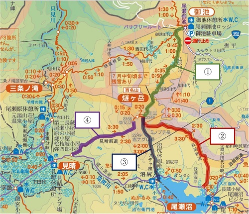 燧ヶ岳に登るには4つのルートがあります。