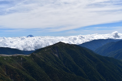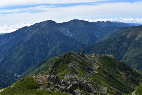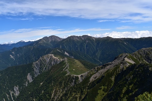 南アルプスの真ん中に位置する塩見岳からは北部と南部を一望できます。この日は天気がとても良かったため、南部の中盛丸山や兎岳などもよく見えました。