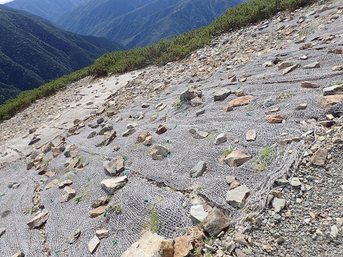 塩見岳東峰直下では環境省事業として、伏工を実施しています。以前の塩見岳東峰直下はシナノキンバイやハクサンイチゲが広がるお花畑でしたが、ニホンジカの採食圧・踏圧によりお花畑が消失するだけでなく、土壌が流失し、裸地化してしまいました。そのため、植生回復および表土浸食防止を目的とし、平成21年から伏工(植生マット)を行っています。今年度は新型コロナウイルスの影響により、伏工の実施業務が中止となっていまいましたが、過年度に設置した植生マットには植物が根を付けていました!