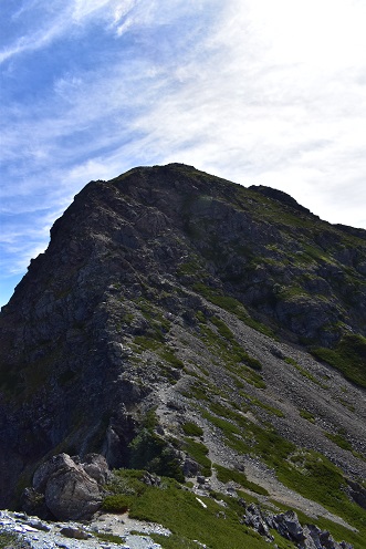 塩見岳の山頂は双耳峰(山頂が2つ)になっており、標高は今年1月に西峰の3,047mから東峰の3,052mに改定されました。あまり知られていませんが、山頂の北側は北岳にもある、¨バットレス¨(切り立っている急峻な岩壁)になっています。