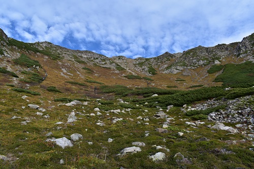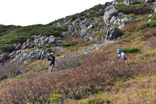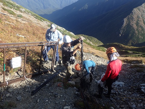 10月初旬に2泊3日で荒川岳の季節型防鹿柵の撤去作業へ行ってきました。例年、7月頃に、ニホンジカが高山へ季節移動して来るタイミングで、関係者による柵の設置作業があり、環境省も同行しますが、今年は椹島までの林道の崩落で通行止めのため、請負業者のみで設置作業を行いました。環境省としては今年度初の荒川岳への巡視を兼ねた防鹿柵の撤去作業になりました。