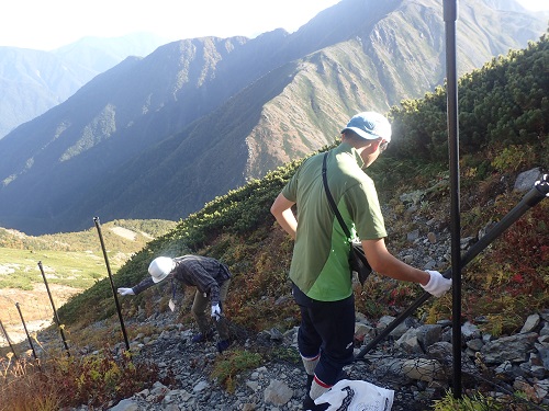 カールの中に柵を2箇所設置しているため、2つのグループにわかれて作業します。柵の大きさにより人数を割り振りますが、大小問わず、この西カールも傾斜がきつく、足場が悪いので作業は大変です。