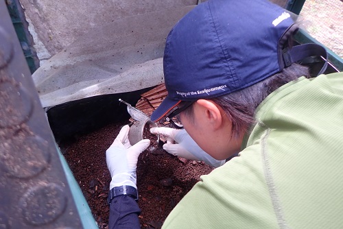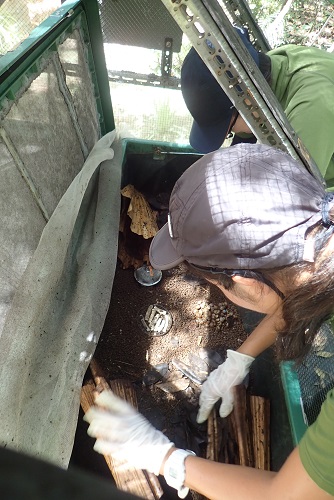▲ふ化個体確認後、卵の回収・状態確認作業中