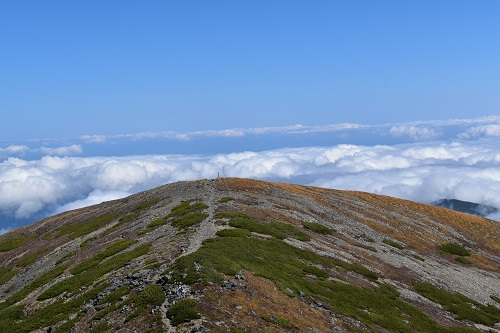 千枚岳と悪沢岳の間に位置する標高3,032mの丸山。その名の通り、丸くだだっぴろい山容です。このあたりは運が良いと、ライチョウを見ることができるスポットです。この日は天気が良すぎたせいか、ライチョウの気配は感じられませんでしたが、見事な雲海!下界は雲空だったかもしれません。雲海は標高が高いところならではの景色です。