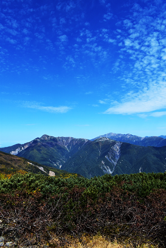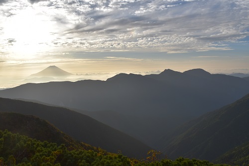 三伏峠・塩見岳の巡視に行ってきました。【塩見岳編】 (10月8日更新)で塩見岳から見た南アルプス北部、南部の写真を掲載しました。今回は荒川岳から見た北部の山々です。手前に大きく見えるのは塩見岳、そこから伸びる尾根は蝙蝠尾根です。奥には三峰岳や間ノ岳、農鳥岳、広河内岳が見えます。北岳や仙丈ヶ岳も頭を出していますね。空の色もグラデーションになっていて、山の美しさを改めて感じました。