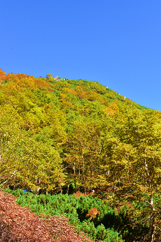 千枚小屋まではシラビソやコメツガなどの針葉樹林が多く、常緑の樹木が多いです。標高約2,600mの千枚小屋周辺まで登ると針葉樹林に加えて、ダケカンバやナナカマドが生育しています。ちょうど紅葉の見頃を迎えており、赤や黄色がとても綺麗でした、雲一つ無い快晴で、空の青色によく映えていますね♪