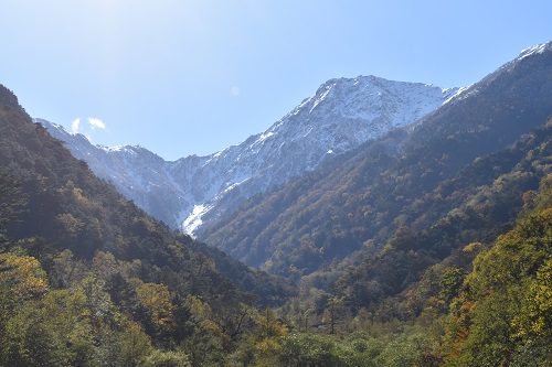 大樺沢や八本歯のコル、バットレスも真っ白です。日が差して暖かく感じましたが、白い稜線部分を見ると、¨冬がやってきた!¨という気持ちになります。広河原の紅葉は南アルプス市内の紅葉スポットの中でも有名で、例年のこの時期は登山者だけでなく、紅葉狩りを楽しまれる方で賑わいます。このほかに広河原周辺では白鳳渓谷(野呂川)や夜叉神峠で紅葉狩りを楽しむことができます。巡視の日は少し時期が早く、はっきりとした色づきではなかったですが、上部は徐々に色づき始めていました。