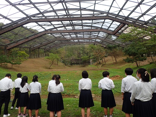 <順化ケージ内で新潟県の獣医師からトキの訓練について説明を受ける生徒>