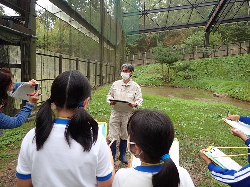 新潟県職員とアクティブ・レンジャーが野生復帰の取り組みのレクチャーを行い、順化ケージを案内して、児童からのトキのプロとしてのインタビューに答えました。