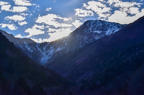 八本歯のコルに日が落ちていくようすが見られ、光の入り方と雲のようすが幻想的でした。日が入る頃には、広河原の気温が7度ほどになり、下界とのギャップを感じました。