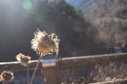 さすがにこの時期にはもう植物は咲いていませんでしたが、フジアザミがドライフラワーになっていました。大きなぼんぼりにふわふわの毛がついていて可愛らしかったです♪