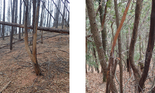 歩き始めて15分ほどで食害が多く見られるようになってきました。樹皮剥ぎや植物の先が食べられており、生育しているササの背はとても低い状況でした。