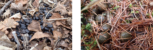 写真左は乾燥しているため黒く、写真右は比較的新しいため水分を含んだ茶色っぽくなっていることから、排泄時間に差があることが分かります。山林内に落ちている糞ですが、よく見ると個体の生活が見えてくるので面白いです。(衛生的な問題もあるので、手にとっての観察はおすすめしません。)