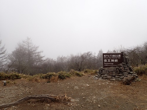 この日の夜叉神峠からの景色は真っ白で何も見えず・・・。平日だったこともあり、登山者も2~3人程度でした。