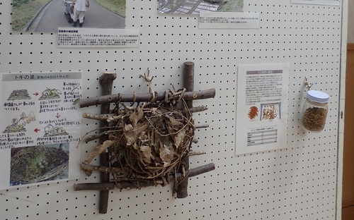 この他にもトキ野生復帰の取組についてのポスターや実物の1/4サイズのトキの巣、飼育下のトキに与える人工飼料の見本も展示しています。