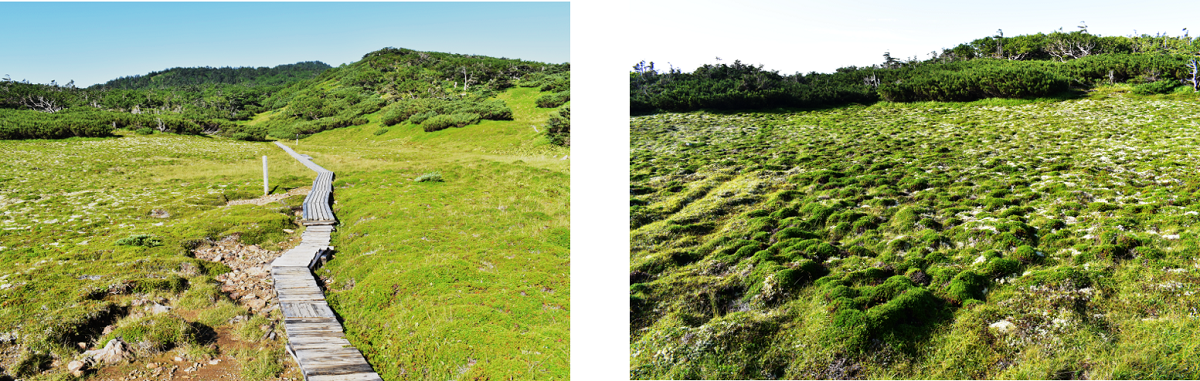 この木道の両脇の草原は構造土(アースハンモック)と呼ばれ、植生に覆われていない部分が先に凍結し、植生がある部分を押し上げてできた地形です。周辺にはイネ科植物やコケ類が被覆し、上部が全く植生に覆われていない「冷凍ハゲ」が分布しています。