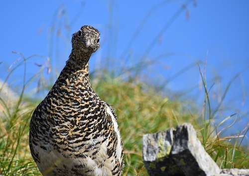 このライチョウはケージ保護されていた母ライチョウです。海外ではライチョウが狩猟対象のため、人を見ると逃げてしまうようですが、日本では古くから神の鳥として崇められ、捕獲や触れることすら禁止されています。そのため、¨人間から攻撃されることはない¨と分かっているせいか、一定の距離を保てば逃げることはあまりないです。一定の距離を保ちながら、望遠レンズで連写しました。カメラ目線で首を傾けてポーズを取ってくれた(?)姿はまさにモデルのよう。私自身、何度見ても「かわいい~」と思ってしまいます。