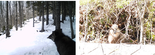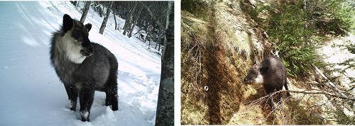 南アルプス自然保護官事務所ではニホンジカ動向調査のために自動撮影カメラを設置しています。ニホンジカ以外にもツキノワグマやノウサギなどが撮影され、カモシカも写っています。
