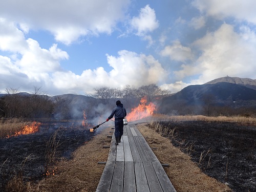 今年は新型コロナウイルス感染症の拡大を防止する緊急事態宣言が発令され、2年連続で箱根の観光名所となっている仙石原ススキ草原での火入れ作業は中止されました。植生復元区のみ、関係者で火入れを行っています。仙石原ススキ草原の火入れは、通常はビジターの見学が可能です。見学してみたいと感じた皆さん、是非来年以降の実施を心待ちにしてください。そして、その作業が「湿原保全活動」であることを知っていてもらえると嬉しいです。コロナ禍も過ぎ去っていることを祈りましょう。
