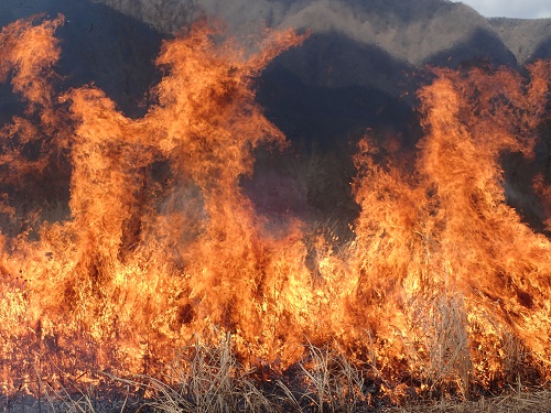 【燃え上がる炎の壁は湿原再生の第一歩です。】