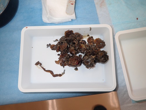 <2021/1/2に死亡を確認した放鳥トキの胃内容物。吹雪が続く中、タニシやガガンボの幼虫を食べて命をつないでいたようです。>