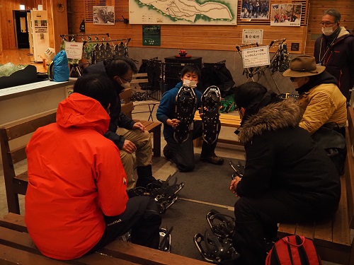 ▲はじめに明るい館内でスノーシューの履き方を教わります。
