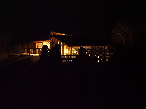 ▲散策から帰ってきました。フィールドセンターの明かりが目に入ったとき、大きな安心感を抱きました。自然への"おそれ"を感じられることも夜のプログラムの魅力かもしれません。