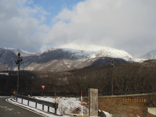 <茶臼岳の山頂は雪雲に覆われている-ビジターセンターより>