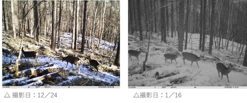 今回は5基中3基のセンサーカメラで12月22日の設置から約2ヶ月の間で撮影できたニホンジカたちを紹介します。