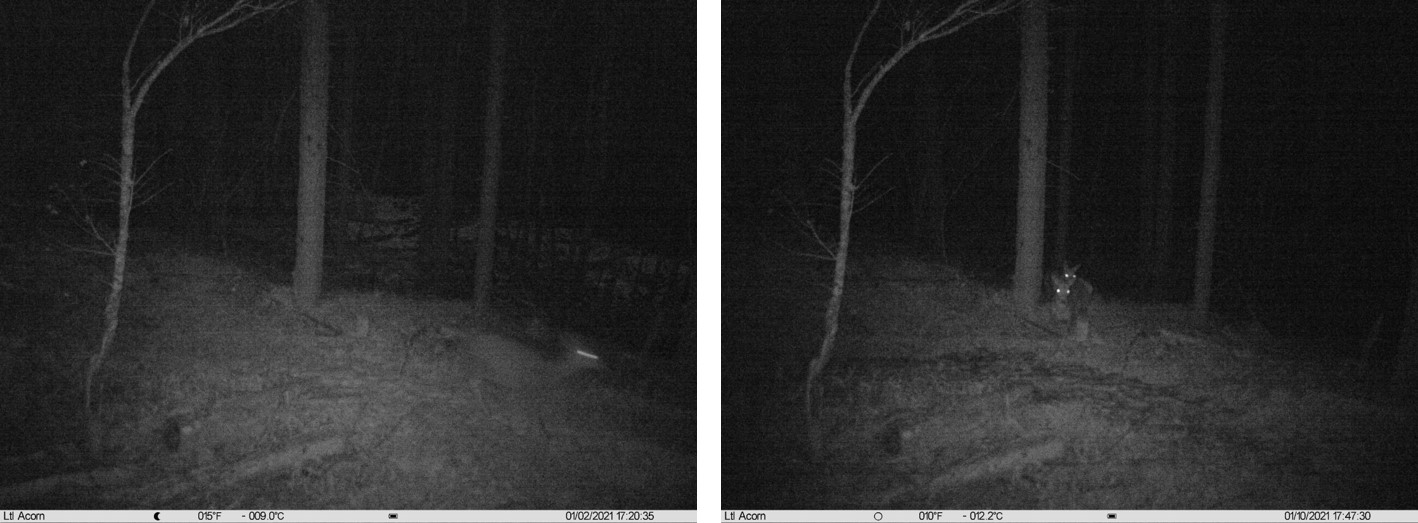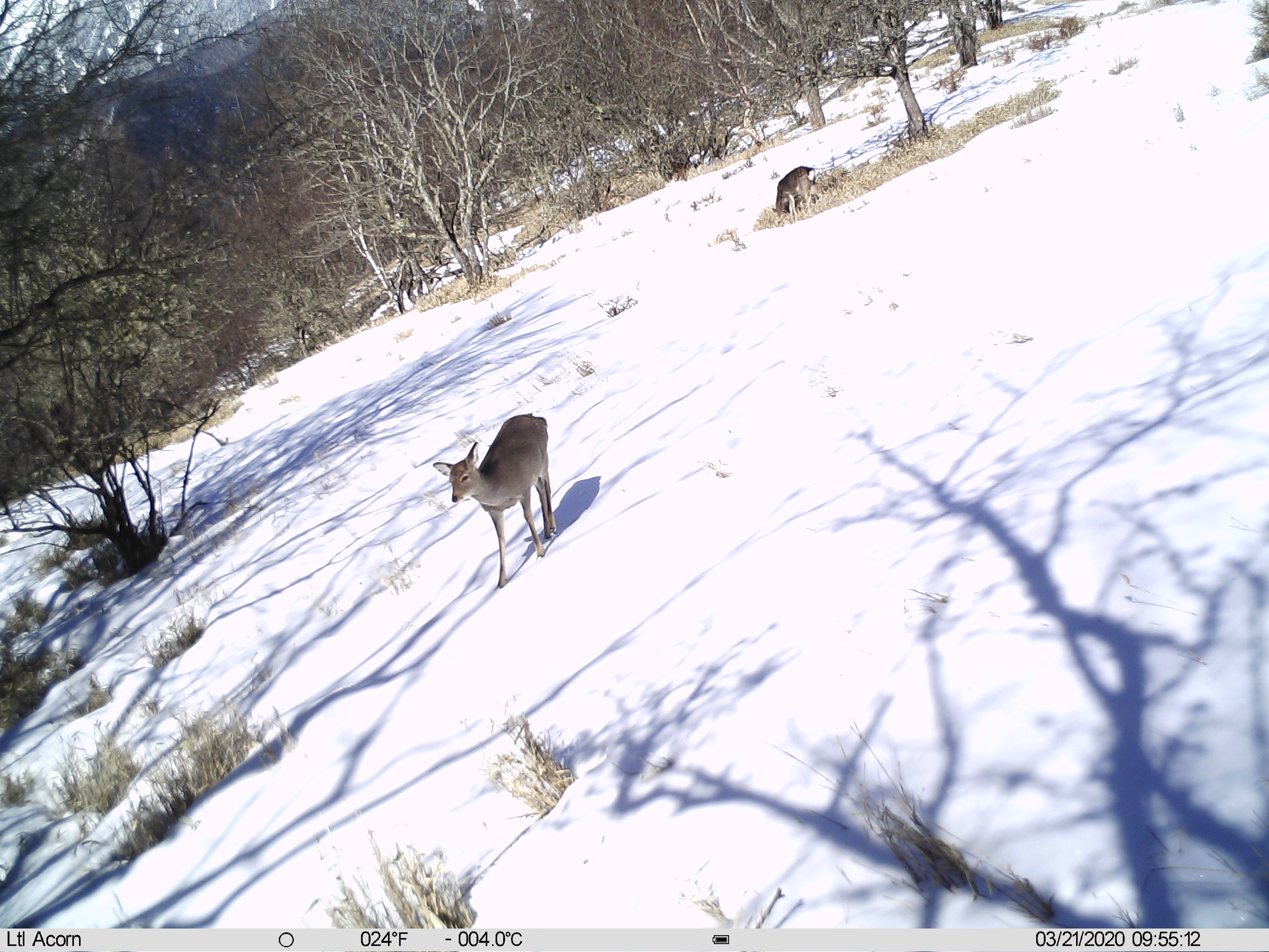 雪の上を歩くニホンジカ。奥にはササを食べている?個体も写っています。一見、驚くような写真ではないですよね。この写真の何に驚いたかというと、撮影時刻が「2021/2/19 9:55」。このセンサーカメラのメンテナンスを行ったのが「2021/2/19 13:00」。 ・・・!約3時間前に撮影できていたことになります。この時期も夜叉神峠周辺でニホンジカが生息しているということを改めて、確認できました!撮影していた9:55、我々は深い雪に足をとられながらセンサーカメラを必死に探していました・・・
