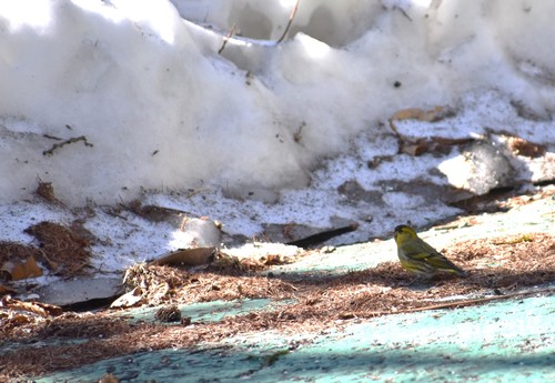 マヒワです。普段は本州中部以北に生息しており、この周辺へは冬鳥として渡来し、カバノキなどの種子を食べています。ピントがずれているのが残念ですが、マヒワを初めて見たとき、「こんな黄色い鳥がいるのか!」と驚いたこと、今でも忘れられません。