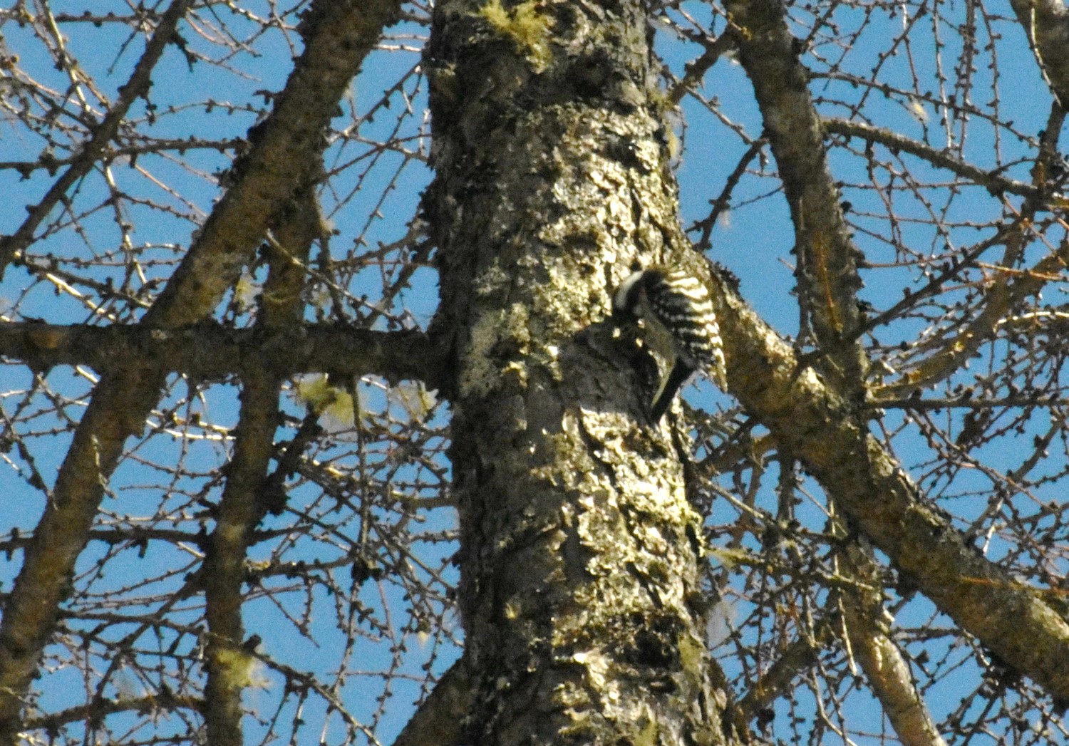 カメラの先にいたのは、コゲラです。焦げ茶と白のまだら模様で、キツツキの仲間です。アカゲラなどに比べて小ぶりですが、尾で体を支えて木の幹に止まり、丈夫なくちばしでつつき、中の虫を食べます。この写真はちょうど木をつついたときです。コゲラは1年を通して日本に生息・繁殖する留鳥です。最近は山林だけでなく、街中でも見かけることが多くなったようです。