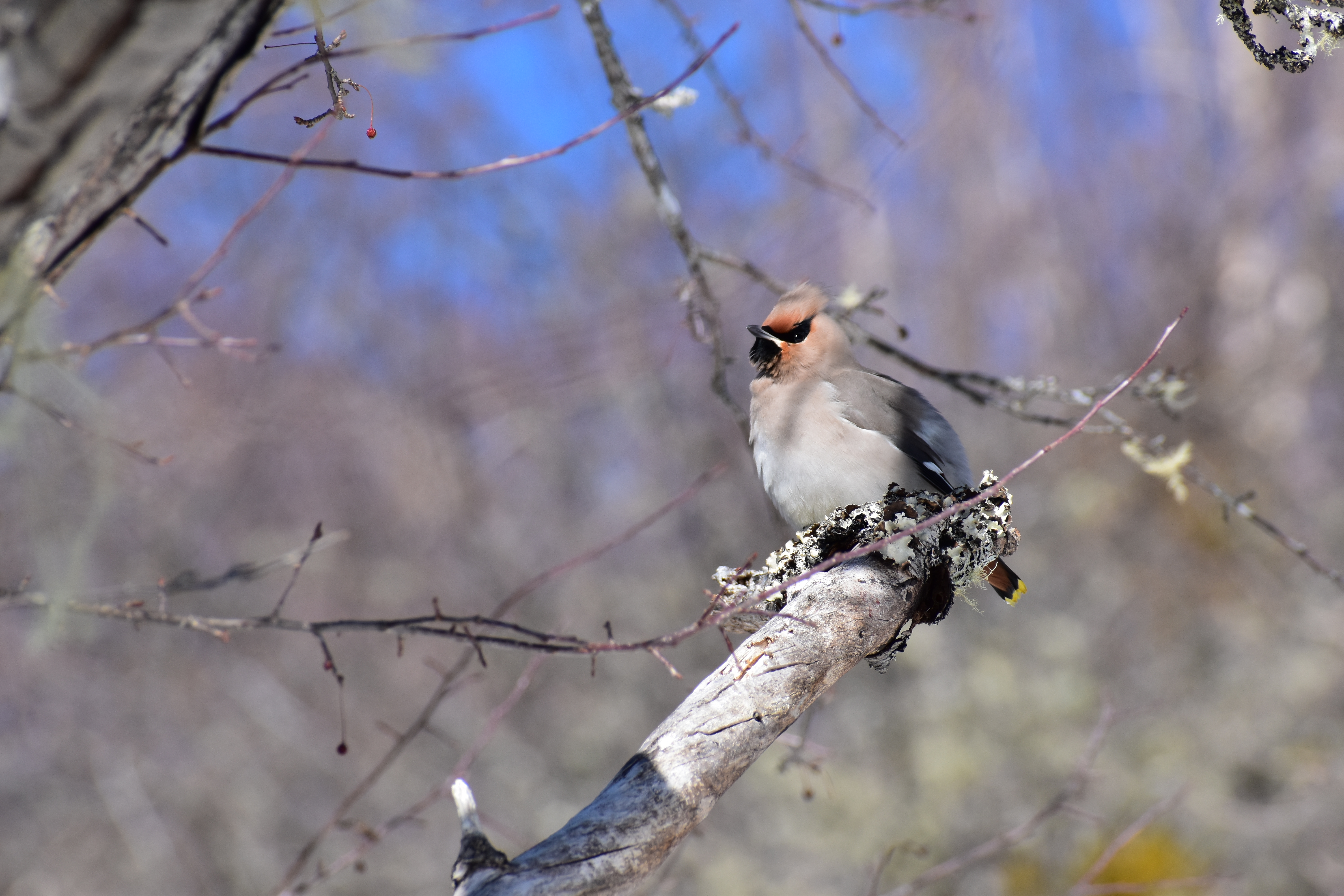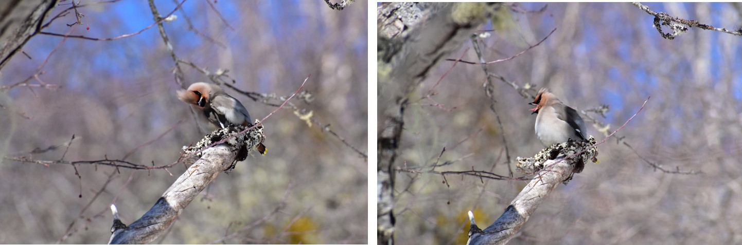 鳴き声の主はキレンジャクでした。冬鳥として渡来し、木の実を食べています。キレンジャクと似ている野鳥として、「ヒレンジャク」がいますが、見分け方は尾の色です。キレンジャクの尾が黄色に対して、ヒレンジャクの尾は先端が赤色です。キレンジャク、ヒレンジャクは互いの群れに混じり合っていることがあるようです。このキレンジャクはシャキッとしている横顔がとてもハンサムでした。
