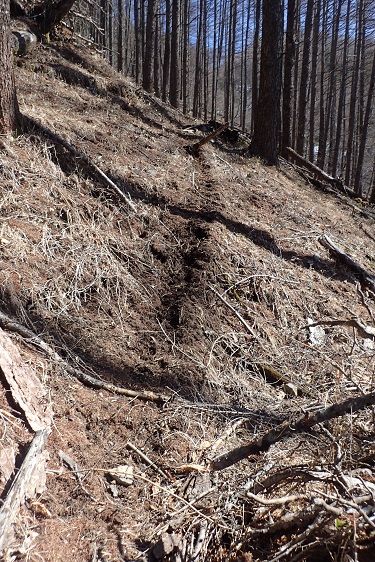 2月に行った夜叉神峠登山口からのメンテナンスでは積雪も多く、シカの痕跡はあまり見られませんでしたが、西口登山道は日当たりがよく積雪も少ないせいか、あちこちにフンや足跡がありました。ひどいところではヒトが歩く登山道上にも!シカ道の利用頻度も多いせいか、乾いた地面がひづめでえぐられています。