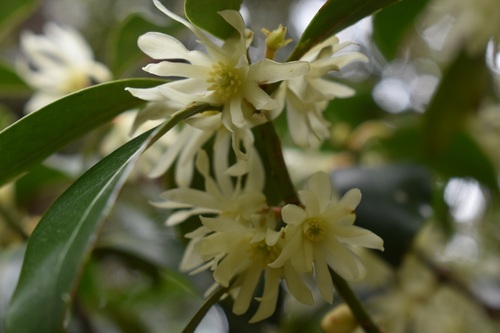 独特の香りがして足を止めると、シキミの花が咲いていました。お花を見てもピンとこないかもしれませんが、仏前やお墓参りに持っていく植物としてスーパーなどの生花コーナーで見かけたことがあると思います。シキミは花や実に猛毒があります。「悪しき実」の「あ」が取れてこの名前が付いたという説があります。
