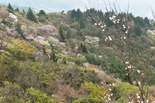 昨年同じ時期に日記で紹介したマメザクラは散り始めていて、歩道が薄ピンク色の絨毯になっていました。時折り吹く風で桜吹雪が舞い、満開の桜もキレイですがこの時期の桜も素敵だなと思いました。少し前の山とは全然違い山全体にたくさんの色が増えています。