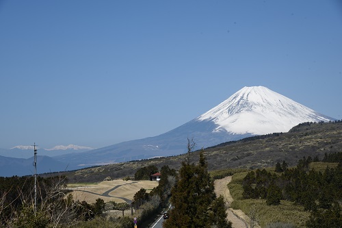 前半は、箱根外輪山の稜線を歩きながら、富士山を眺められる素晴らしいコースです。左側には南アルプスもうっすら見えています。この南アルプス、箱根の北側にある明神ヶ岳からは、富士山の右側に見えます。業務でよく明神ヶ岳に登る高木ARからは、不思議な眺めだと感想がありました。