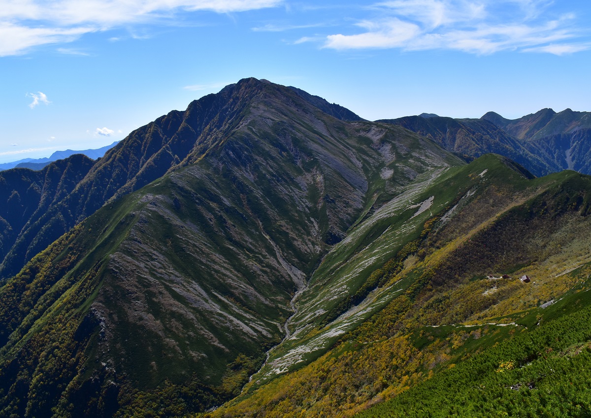 こちらから見ると、V字谷がよく見えます。南アルプスは降雨が多く、地形が流水によって削られやすく、その結果出来る特徴的な地形が、このV字谷です。雑誌などでは花の時期が取り上げられていますが、紅葉の時期は山そのものがより大きく見えるので、個人的に大好きな構図です。