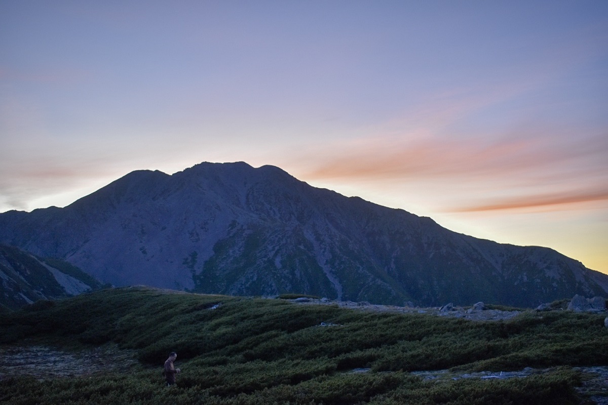百間平は聖岳から赤石岳へ向かう途中の真っ平らで歩きやすい場所です。後ろを向くと聖岳、前を見ると赤石岳、名峰に囲まれながら歩くことができます。中岳下から見る赤石岳と違って、なだらかでなんだか、やさしさを感じるような・・。写真は夜明け前に撮影し、逆光になっていて斜面の様子がはっきり見えないので、よりいっそう感じます。ただ、実際のところは大きな岩や石がゴロゴロしている斜面を歩き、その後、ザレ場を歩いて、山頂に辿り着きます。見た目に反したギャップがまたいいです!