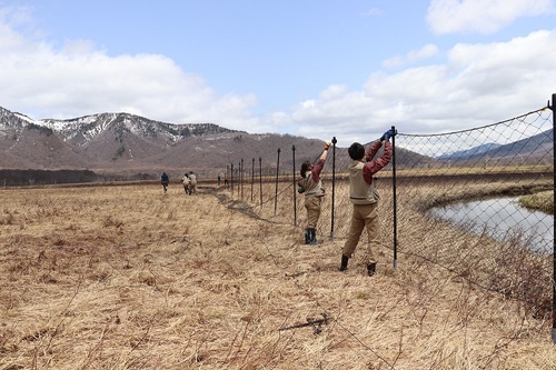 土壌を掘り起こして泥浴びをしたり、踏み荒らしてしまうことで湿原が露出してしまったり、採食被害もあります。尾瀬では、そういった被害に対し様々な対策を進めています。ここ数年では、植生保護や景観維持のため、柵を設置していますが、今年度は、環境省と連携協定を結んでいる地元の尾瀬高等学校の理科部の皆さんと一緒に植生保護柵を設置してきました。専門業者の方々のご協力をいただきながら無事に設置でき、高校生も体験することで色々感じていただけたものと思います。