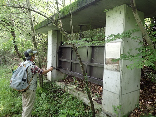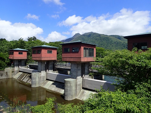 上部写真の「湖尻水門」は、大雨等で芦ノ湖の水が増えすぎた際に解放される水門です。今の姿は平成2年に立て替えられた新しいものです。それ以前は手動の水門だったそうです。パークボランティアさんの中には、以前の古い湖尻水門を実際に手動で締めて、芦ノ湖の水量を管理した経験者がいます。経験者が語る、リアルな水門管理のお話は、聞き応えがあることでしょう。