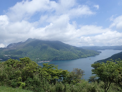 箱根の名所を一度に見渡せる景観が広がります。箱根には火山活動と人の暮らしが両立してきた歴史が有り、「ジオサイト」と呼ばれる、大地が動いている軌跡が各所にあります。この風景を眺めながらパークボランティアさんのガイドを聞くことで、「ジオサイト」の点と点をつないだ線が見え、箱根ジオパークの全体像が感じられました。スタート地点の箱根ビジターセンターも見えて、歩いた距離の実感も湧きますよ。