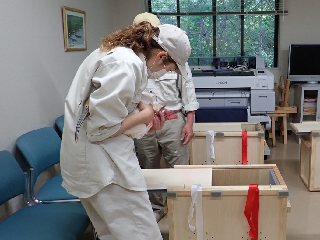 佐渡トキ保護センター野生復帰ステーションの順化ケージで約3か月間の訓練を受けたトキたちを捕獲し、放鳥箱に入れて放鳥場所まで移動します。