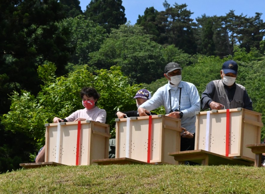 放鳥者が放鳥箱にかけられた赤と白のテープをハサミで切ると・・・